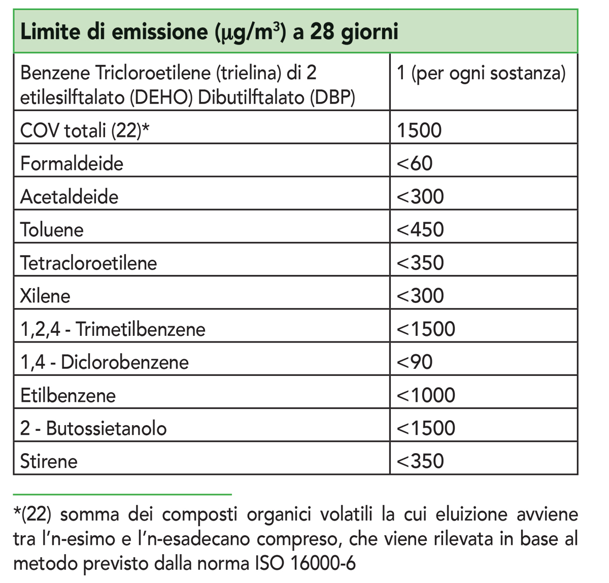 Di seguito Tabella CAM delle emissioni limite dei principali VOC