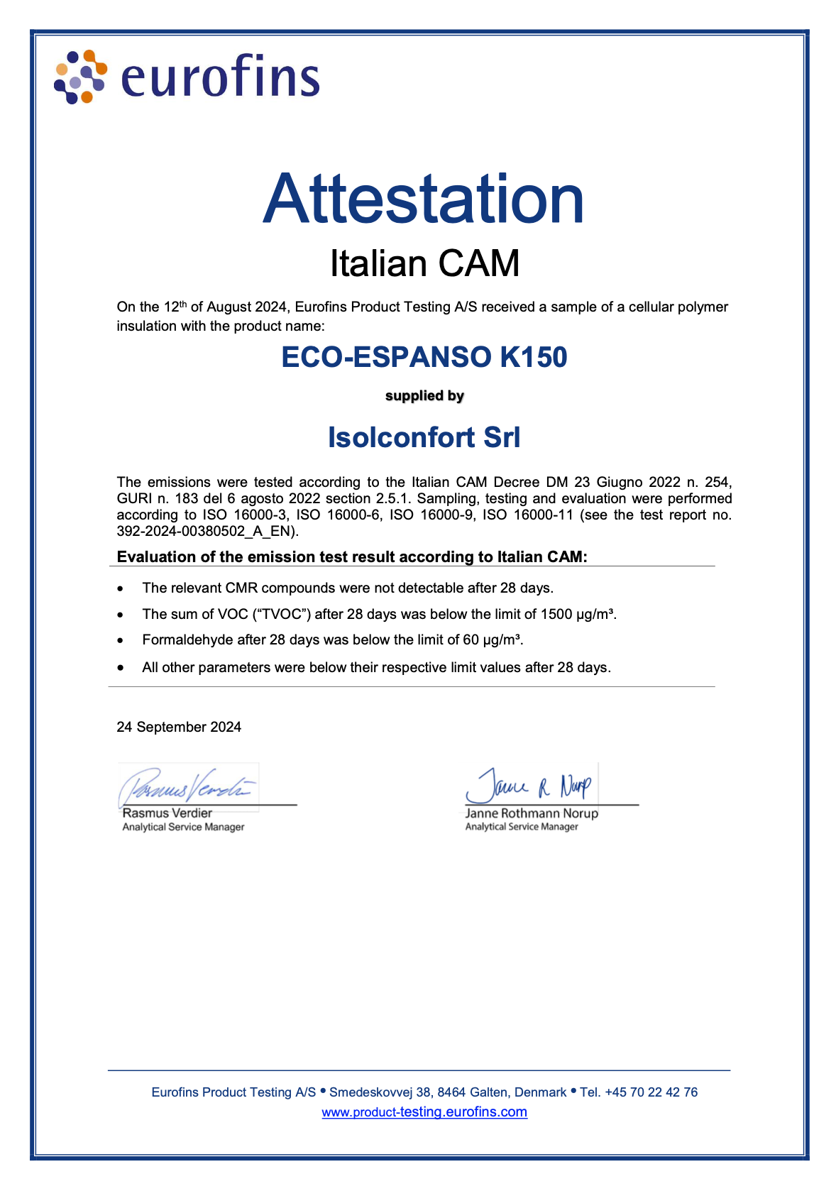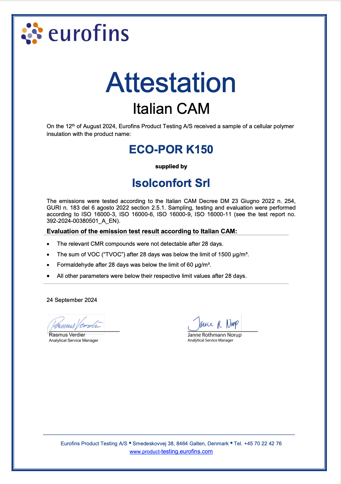 Il risultato è stato molto positivo, il materiale è stato classificato secondo gli standard LEED “Prodotto a basse emissioni”, le analisi, inoltre, hanno mostrato che le emissioni VOC dell’EPS Isolconfort sono inferiori rispetto ai limiti previsti sia dalla normativa CAM Edilizia italiana, che dalla regolamentazione tedesca, belga e francese per la quale ha ottenuto la classificazione A+. Questo mostra come i panelli coibenti di Isolconfort siano sicuri e salubri e non mettano a rischio la salute degli operatori e degli abitanti degli edifici dove i nostri materiali sono impiegati.