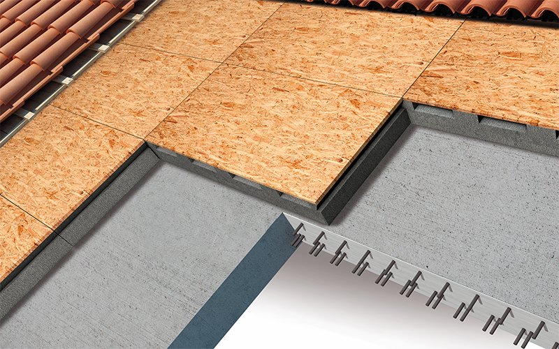 La copertura è composta da un pannello in EPS con grafite Neopor® di BASF, appositamente sagomato con canali di ventilazione a sezione rettangolare e accoppiato con una lastra di chiusura in EUROSTRAND OSB, realizzata con essenze legnose stabili trattate contro l’attacco di muffe e parassiti, molto resistente alla compressione, idroresistente, pedonabile per la posa ed incomprimibile dal peso di un’eventuale impermeabilizzazione e dai manti di copertura normalmente utilizzati. Il pannello è battentato sui due lati corti per assicurare l’eliminazione dei ponti termici ed i canali di ventilazione sono realizzati per agevolare l’evacuazione dell’umidità causata dalle escursioni termiche.
