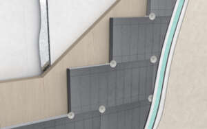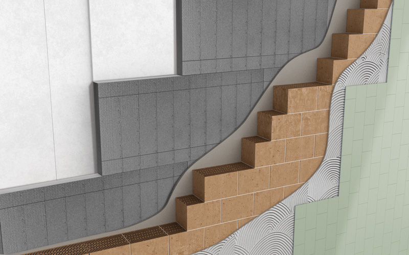 Isolante stampato con materia prima proveniente da riciclo o da fonti rinnovabili tipo Neopor® BMBcert® di BASF a basse emissioni di CO2 realizzato con goffrature per migliorare l’aggrappaggio e pre-tagli all’estradosso per garantire un’ottima stabilità dimensionale.